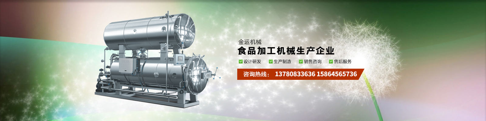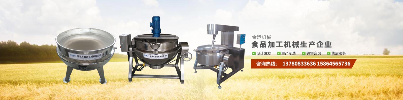 主要產(chǎn)品有:行星攪拌夾層鍋、夾層鍋、壓力煮鍋、各種餡料炒鍋、殺菌鍋(殺菌釜)、巴氏殺菌機(jī)、清洗流水線、風(fēng)干線、真空包裝機(jī)、滾揉機(jī)、斬拌機(jī)、鹽水注射機(jī)、大蒜脫皮機(jī)、大蒜分瓣機(jī)等,廣泛應(yīng)用于各種食品加工、食品殺菌及農(nóng)產(chǎn)品深加工、化工、醫(yī)藥的生產(chǎn)等。可滿(mǎn)足外資企業(yè)、合資企業(yè)及國(guó)內(nèi)大中小企業(yè)生產(chǎn)需求,產(chǎn)品暢銷(xiāo)全國(guó)各地。